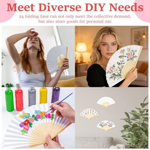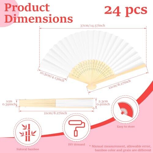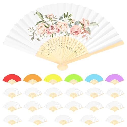 Blank double‑sided white fan surface suitable for painting, calligraphy, graffiti, and sticker DIY; bamboo fan ribs made from natural bamboo, resistant to breaking and deformation, lightweight, with secure connection for smooth opening and closing; pack includes 24 blank folding fans; folded size is compact for easy storage and portability; fan surface is thick, flat paper with moderate water absorption, resistant to ink bleeding and wrinkling when using watercolors or inks, and prevents marker ink from seeping through.