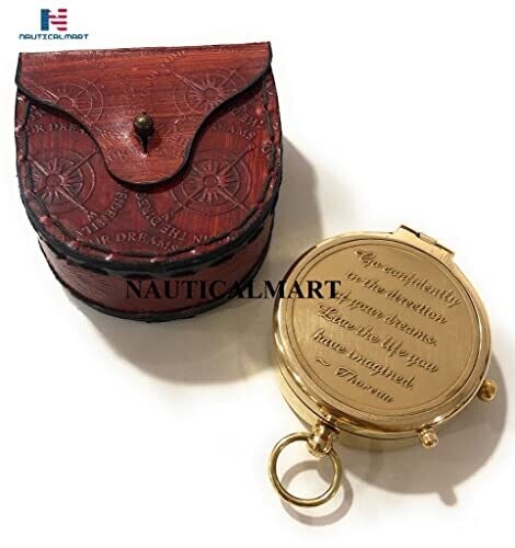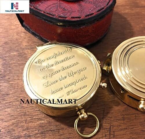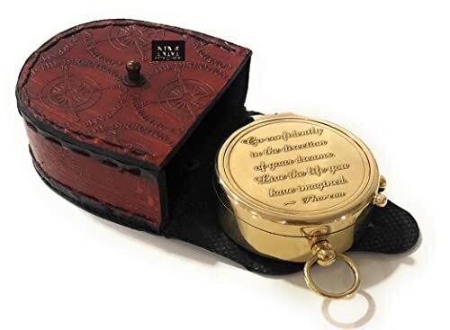 Premium brass compass engraved with Thoreau's Go Confidently Quote, housed in a stamped leather case. Ideal for corporate gifts, promotional products, trade show gifts, and personalised bulk orders for birthdays, graduations, or milestones. A timeless keepsake for travelers and professionals.