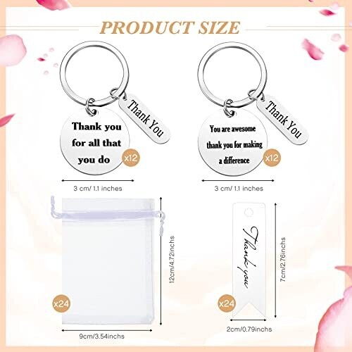 72. Contents include 24 thank-you keychains in 2 styles, 24 organza bags, and 24 thank-you cards.