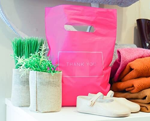 Pink bags with a thank you logo to enhance customer experience.