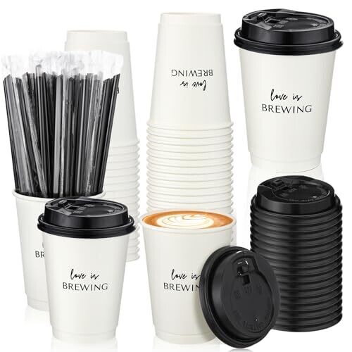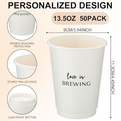• Jingmore 50 Pcs Disposable Wedding Cups Bulk 12 oz Love Is Brewing Bridal Shower Wedding Reception Drinking Cups with Lids Custom Wedding Cups for Engagement Bachelorette Party Supplies — a practical yet stylish choice for your celebration.
