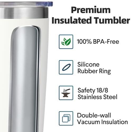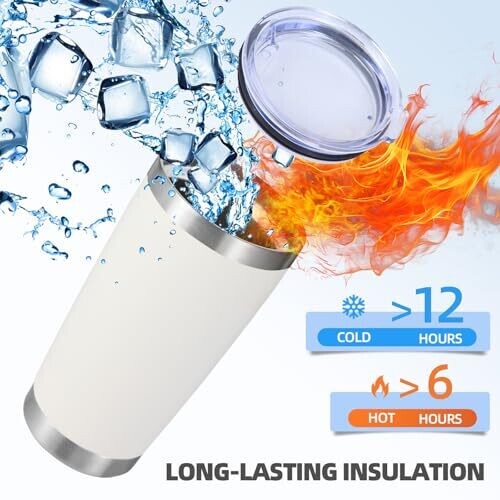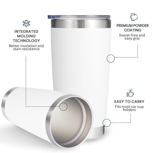 20-ounce capacity. Made from food-grade 18/8 (304) stainless steel. BPA-free lid and rubber gasket assembly. Lid provides splash-proof performance with a gasket seal. Double-wall insulation maintains beverage temperature and prevents condensation. Powder-coated exterior for enhanced durability and color retention. Dishwasher-safe for easy cleaning. Base diameter designed to fit most automotive cup holders (2.76 inches). Includes four pieces per bulk pack in white color option. Product available as a multi-pack; colors may vary by batch. Bulk 4-pack suitable for gifting or sharing. Customer service available for product issues.
