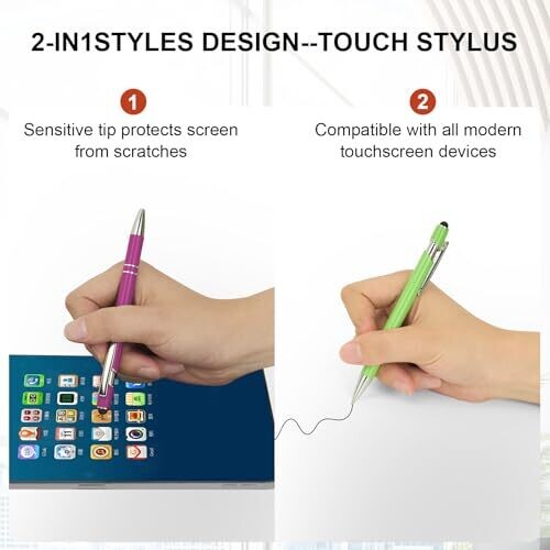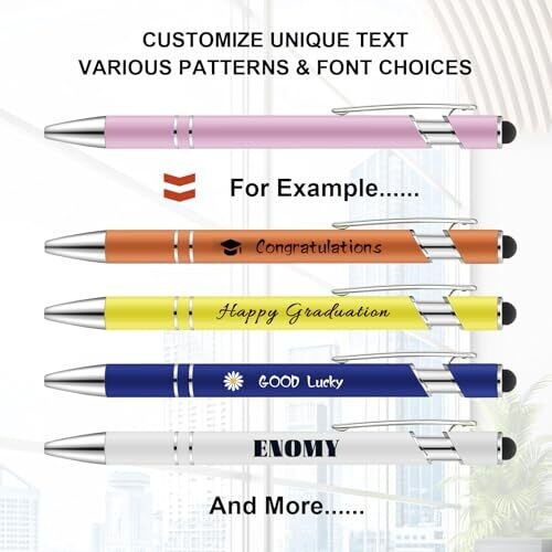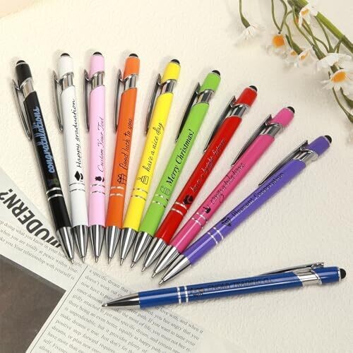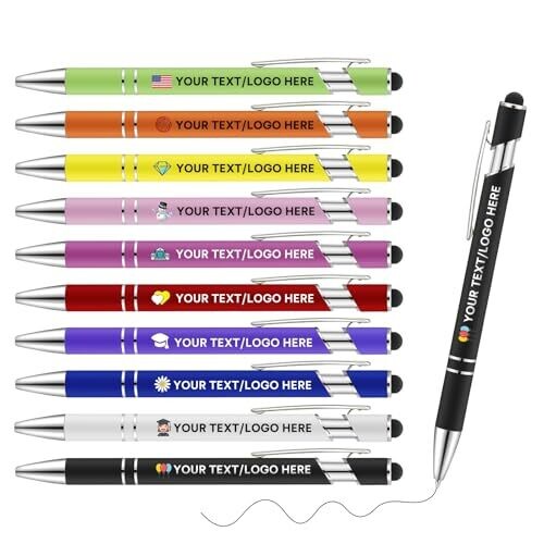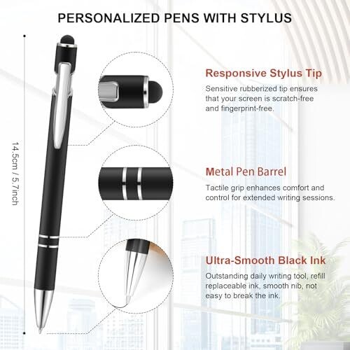 Product is a personalized ballpoint pen compatible with custom branding, available in bulk with black ink. Customization supports name, logo, or message for individual or corporate use, suitable for tradeshow, corporate events, offices, and educational settings. The pen features a durable construction, smooth-writing ink, and an ergonomic design intended for extended use, and includes a 2-in-1 stylus suitable for touchscreen devices. The gifting option is positioned for personal, educational, and professional gifting, with personalization as the primary value.