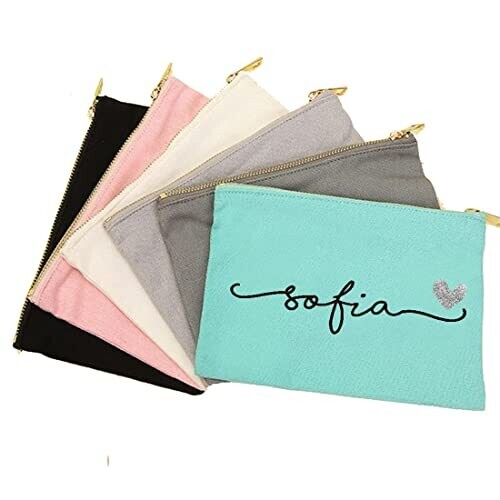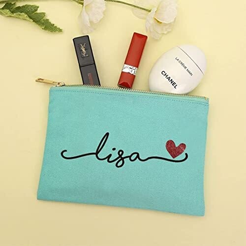 - Personalized makeup bag designed to carry cosmetics, travel essentials, and small personal items in a stylish canvas tote.