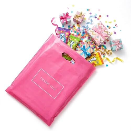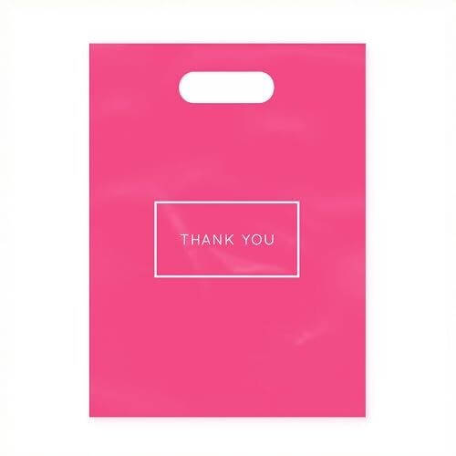 Purple Q Crafts Pink Die Cut Plastic Shopping Bags with Thank You Logo 9" x 12" Boutique Bags with Handles 50 Pack for Merchandise, Gifts, Trade Shows and More